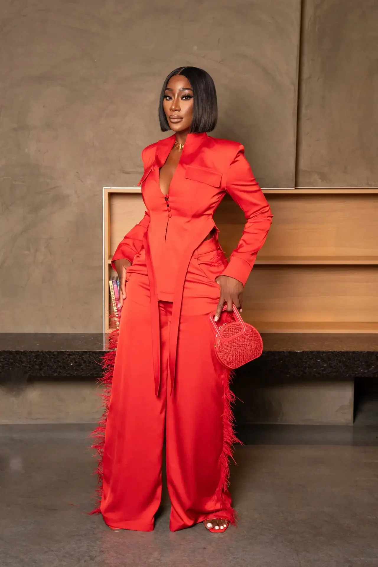 Command the room in theLeading Lady Red Satin Feather Suit. This bold pants suit features a blazer-style top and feather-trimmed pants that demand attention. Made to elevate your executive slay and turn every entrance into a moment.