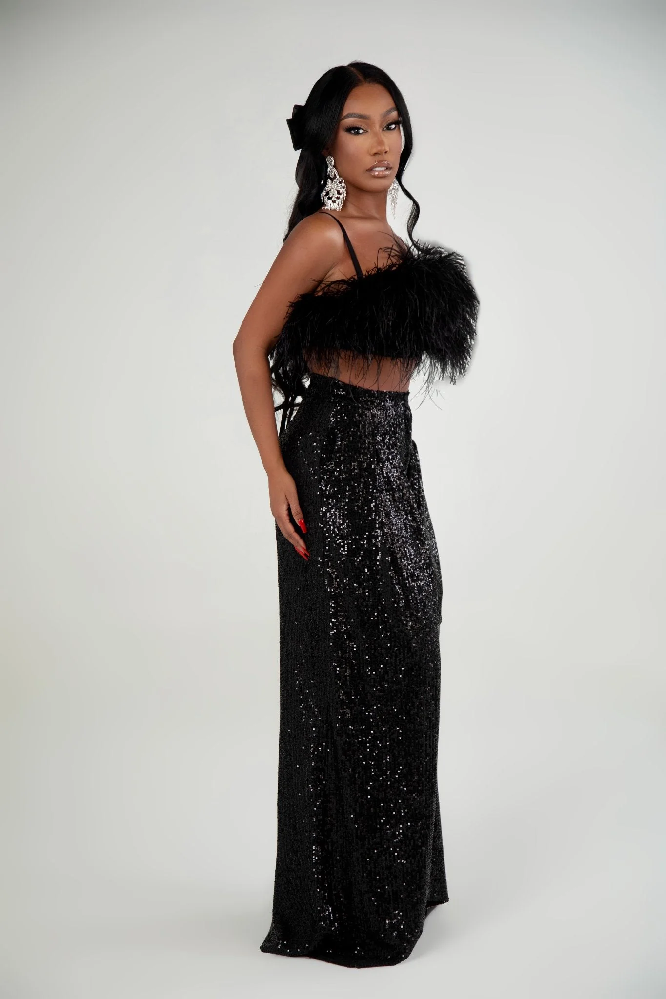 Enhance your holiday style with the luxurious Mila Black Feather Top, designed for those who love a touch of drama and elegance. Featuring soft feathers and a lace-up back, this strapless top brings a bold yet playful vibe to any festive occasion. Pair it with sequin pants or a sleek skirt for an effortlessly chic ensemble perfect for holiday parties or glamorous celebrations.